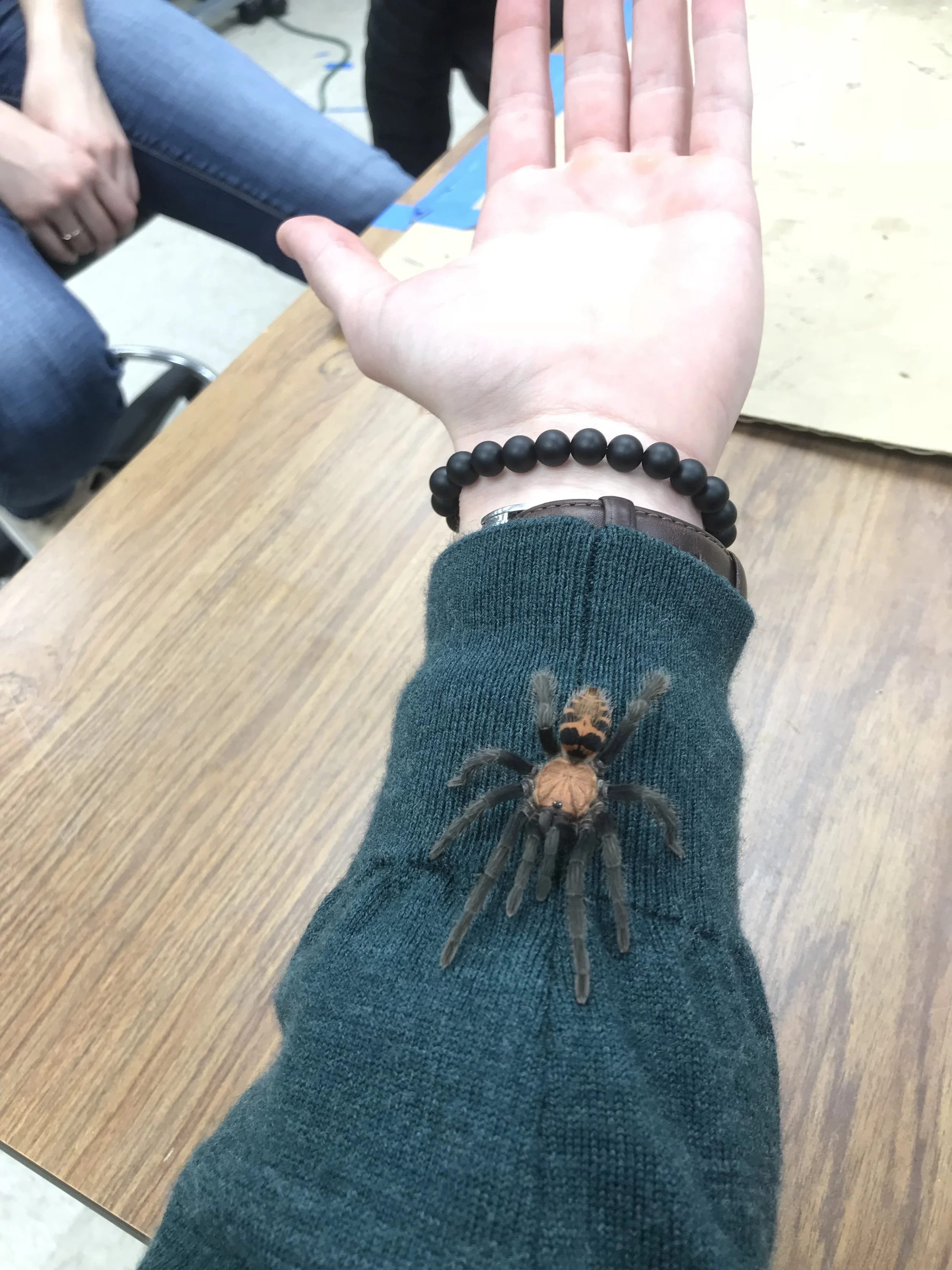 In my third year of college, I began working in the Hsieh lab at Temple University as part of the undergraduate research program. Research in this lab was primarily concerned with biomechanics. In my first semester conducting research with the Hsieh lab, I participated in a project exploring the gate pattern of the Guatemalan tiger rump tarantula (Davus pentaloris). Using high speed video cameras, we tracked the gait patterns of several tarantulas before and after a standardized limb autotomy event. Ultimately the findings suggested that the tarantulas readily modify their gait and sustain little to no decrement in speed.